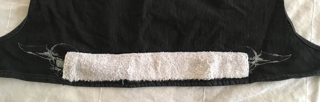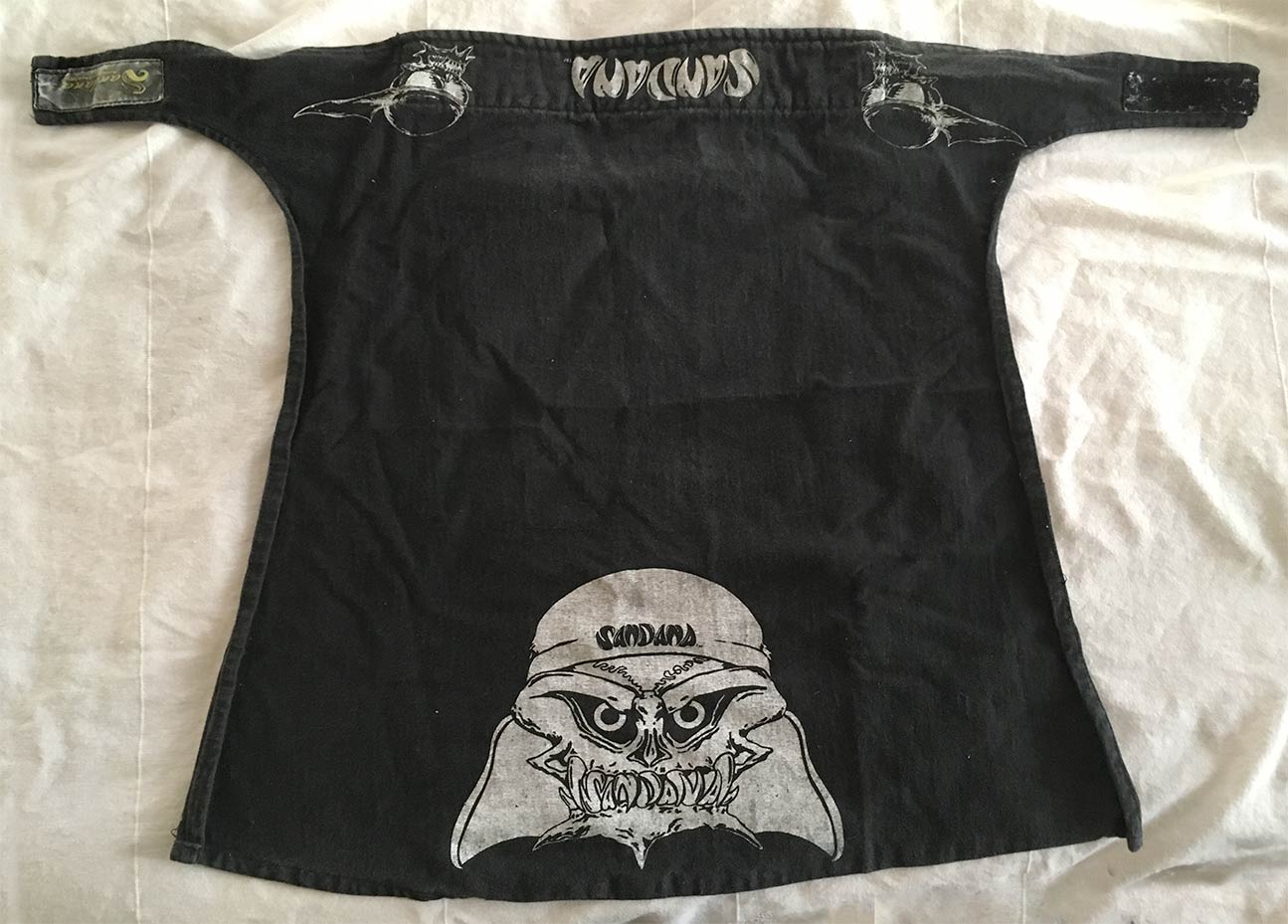 The same skulls are silk screened on the back of the head wrap. This is directly underneath the front silk screen. The back terry cloth looks to be in decent shape.