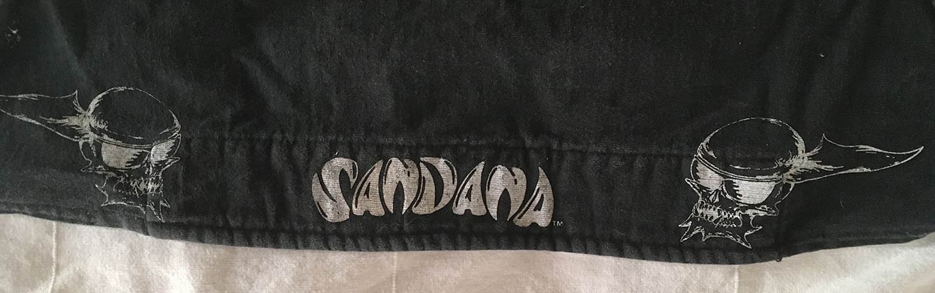 The front head wrap has the flying skulls silk screened on it. I didn’t realize before, but these are actually skulls wearing Sandana head wraps.