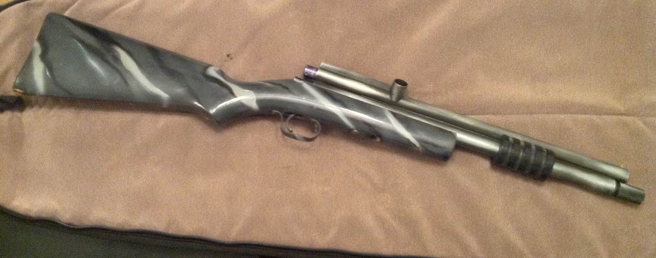 Here’s a 1st generation Annihilator Rifle that went though several owners before I found it. One of those owners was “Rick the Prick” of Paintball Pro Shop, maker of the Sheridan based Stainless steel barreled Viper pump. I believe Rick was the one to apply the urban camo paint job to the stock.