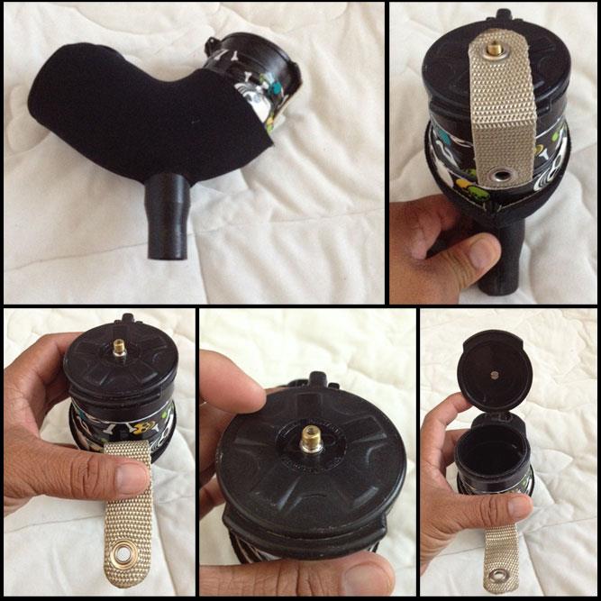 Eliminating the clear plastic loading lid Alex taped on a standard 100rd pod lid and used a post and grommet to hook the lid closed in play.