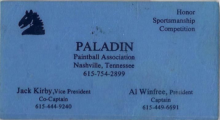 Late Fall 1989 (November maybe?) – Paladin combines with Mokokhan (also a 5 man team) of Paducah, KY and a group of Nashville Paintball regulars to compete in the 15 man division at the Line SI Masters in Nashville. The 15 man team is called “Paladin”.