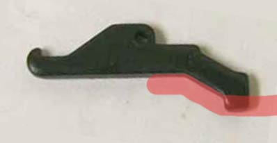 And here is a NW or early Carter comp/buzzard trigger. This trigger is rounded on top and relies on both a different sear (non stock) and this round top of the trigger for the correct contact point with the breech being closed. Carter and NW both used the same frames and triggers early on that were machined by Tri Jay Machine, a machinist who had some relation to Nicky Wilson.