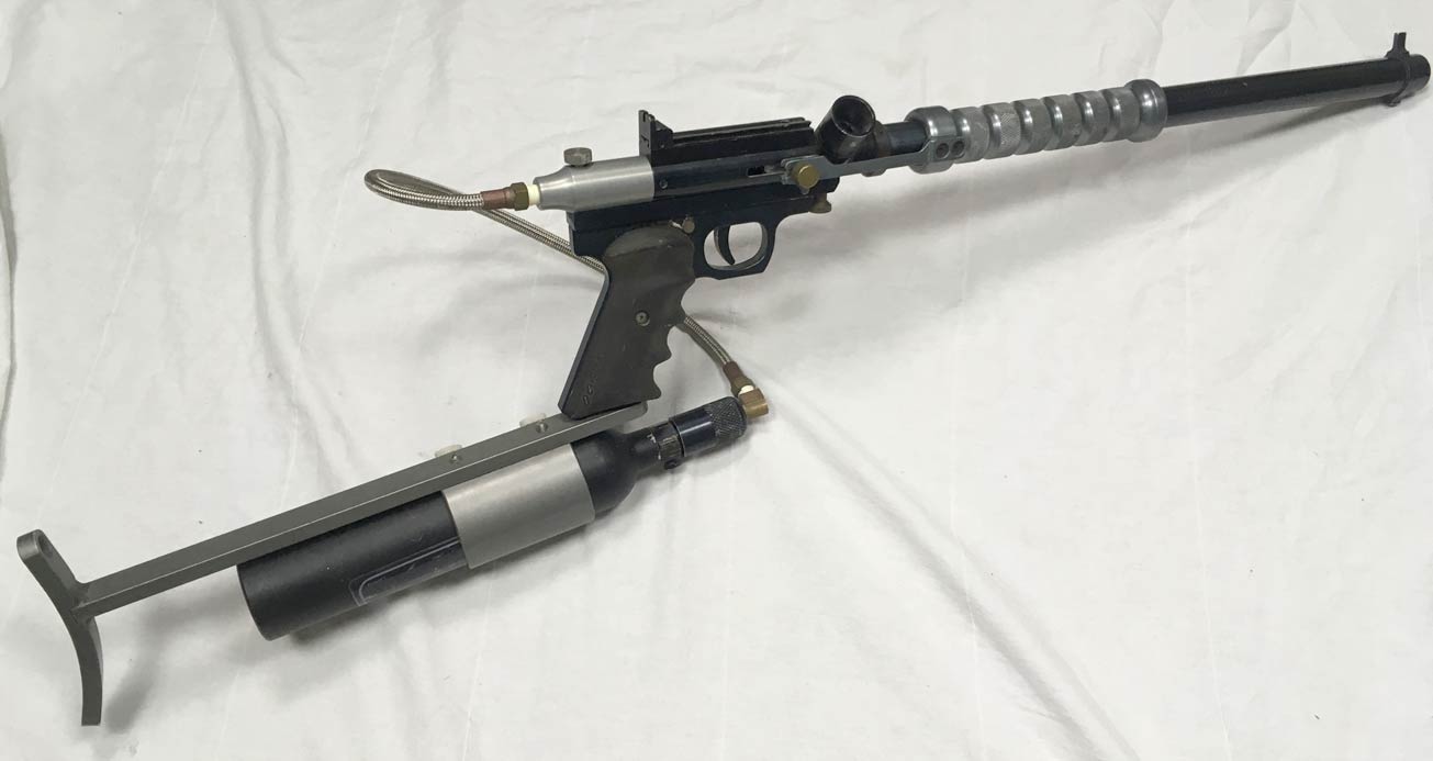 This example may have come with the Wintec one piece frame, since AGS used the Wintec /Lapco frames after 1990 when they split from Taso. The super long barrel has Taso / AGS threads and could have also been stock.
