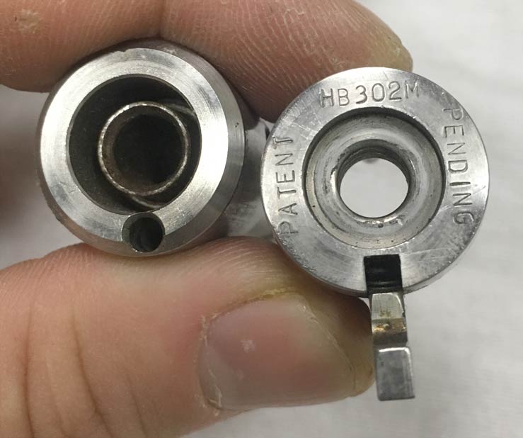 These internals are stamped with “Patent Pending” and “HB302M.” Hypertech’s approach was unusual and likely not duplicated because of the “patent pending” attempt and the need for a more exact fit. If the pump these were used in had a sear slot that was even slightly out of spec then there could be mis alignment issues (I would imagine?).