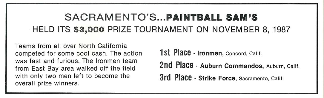 The outcome of one of Paintball Sam’s tournaments was also printed in the January 1988 issue of Front Line, so it would make sense that photos taken at the same event (if developed quickly) could also be added to the layout. And since the Ironmen did place first in that event, the photos where Baird and others are holding up their index finger could be from that tournament.
