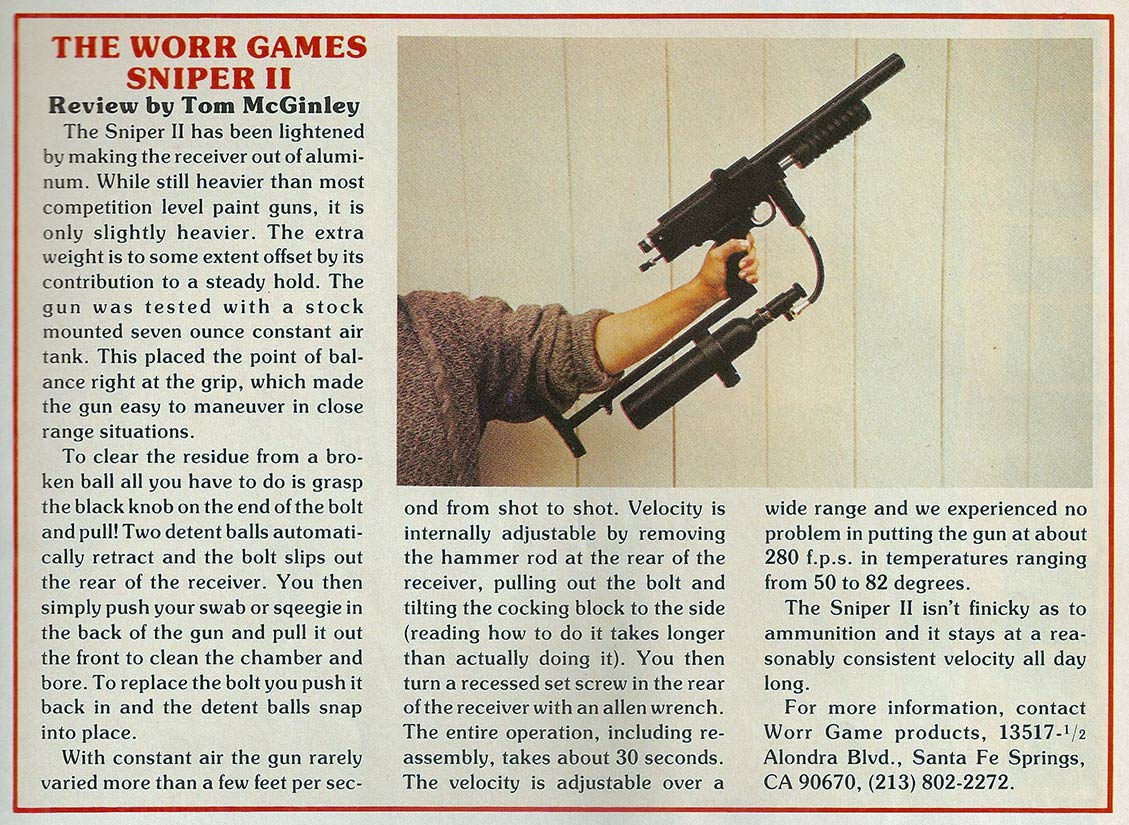 The Paintball Sport International featured a new product write up for Worr Game Product’s Sniper 2 in the April 1990 issue. Since magazines at the time had a typical three to four month period between article submission and printing, the date of April would likely mean the Sniper 2 was probably introduced in late 1989.