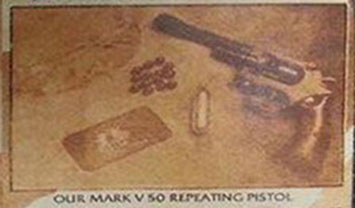 This brochure also offers some insight into the nearly forgotten pistol used at the Joe Survival field, labeled as Joe Survival’s “Mark V 50 Repeating Pistol.”