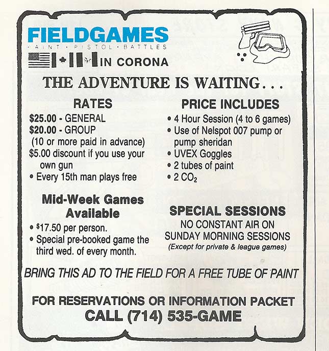 Gale Gough, of Aerostar, was a partner in Field Games, possibly with Ron Kilbourne, so it would make sense that Kilbourne would be able to get discounts on Aerostar’s paintguns and equipment. John “Mike” Hyatt, who was employed by Gough at Aerostar’s shop in Brea, California, from 1988-89, wrote me that, “Gale owned [Field Games], but I’m not sure if Ron was co-owner(?). [The] Bushwackers practiced at the Field Game often.”