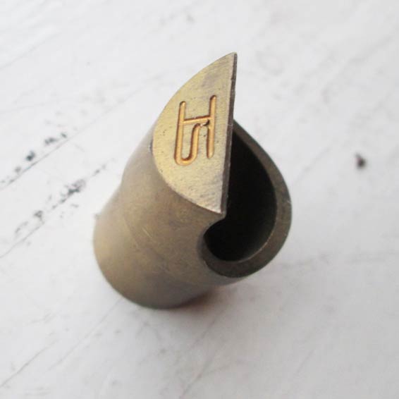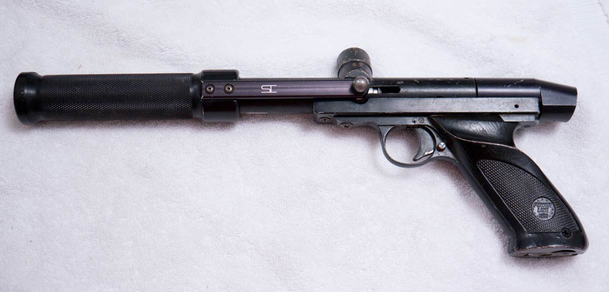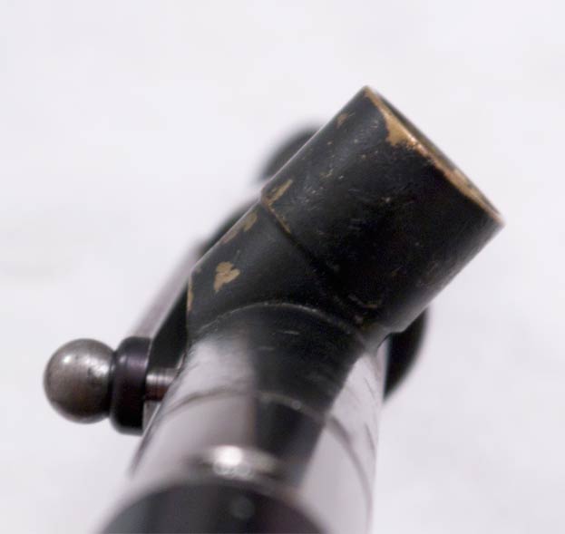 This Brass Feedneck, offered by Line SI, was cut on the bottom to fit either a Sheridan brass barrel or a stock Nelspot 007 Steel body. Once the stock feed was removed, this feedneck would be soldered on.