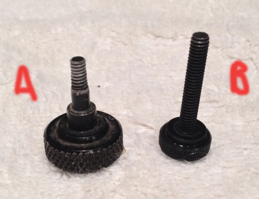 In the photo above, A is the shorter 8×32 screw for the later style bushmaster frame. The longer screw, B, is also 8×32 and is the more common screw which works on the majority of Bushmaster frames.