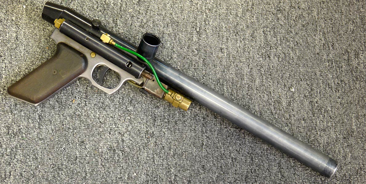 “…Bud got to see [the Double Barrel typhoon with the horizontally mounted switch] at the Easter Seals Game at Paintball Hill in April of 1990. He showed up at the Bay City Open, 2 months later, with his first attempt at a ‘cocker, but he still didn’t know how to make it work.”