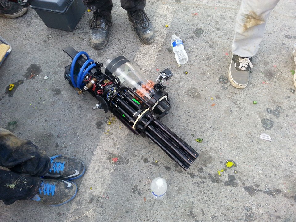 I grabbed my camera and took a quick video asking Rick some questions while he was locked out of his car and getting some footage of what looks like 8 or 10 Ion’s cleverly arranged into a rotating Paintball Minigun, with a Makita drill grips and fed from a side cylinder that must hold a thousand or maybe two thousand paintballs at a time?