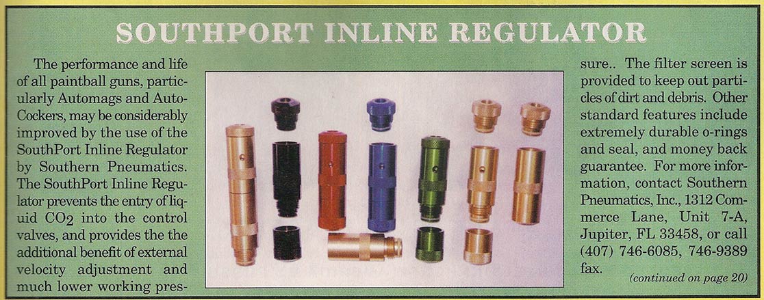 On November 11th of 1994, user S. M. Slamon posted to Rec.Sport.Paintball, regarding his attempts to contact Eric Scott, at Southern Pneumatics, concerning issues with his South Port Regulator: