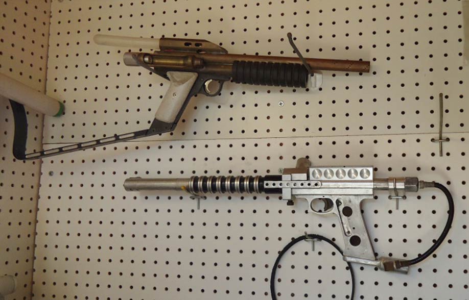 In March of last year (2014), when Paul and I visited Earon again, this Buzzard/Termite was still hanging on the wall and since last seeing it a few more pieces were missing (sight rail, grips, internals). It was obvious that this piece of history would become more dilapidated if we left Chula Vista without saving it. And with some begging, Earon eventually gave this early paintgun to Paul.