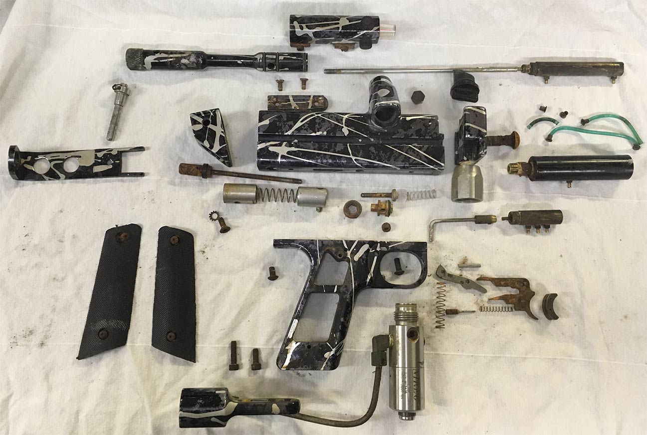 Breakdown shot of Rick’s Minicocker. Disassembled with the help of Paintball Tek dot com!