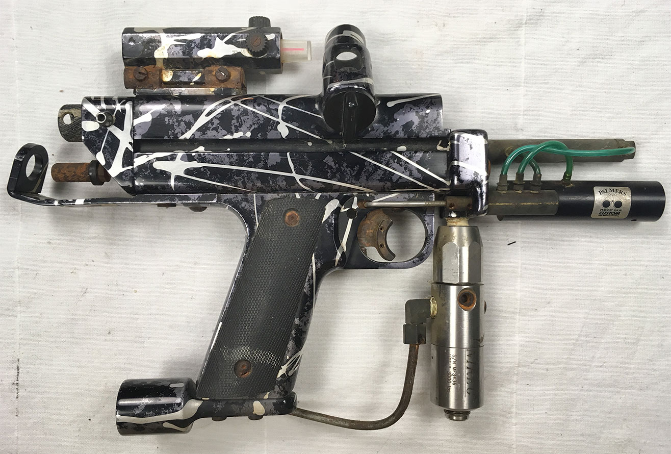 I asked Rick about the cuts and he explained that he cut this custom Minicocker while working as a machinist at Concord Naval Weapons Station. The base gun was a stock Mini he received as part of the Ironmen’s sponsorship with Worr Game Products. Rick writes, “This Autococker was acquired during our sponsorship in the early 1990’s, probably close to 1992. I did not make it a Mini, so it must have come that way.”