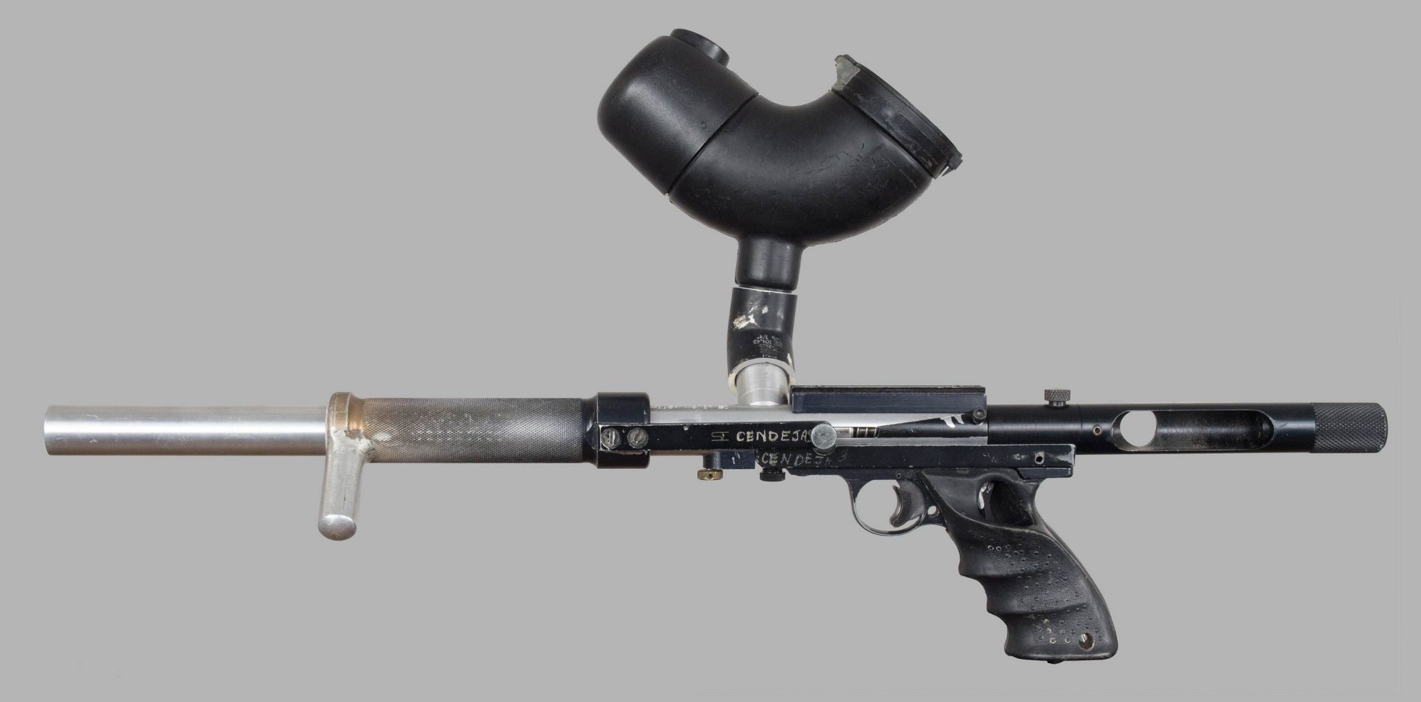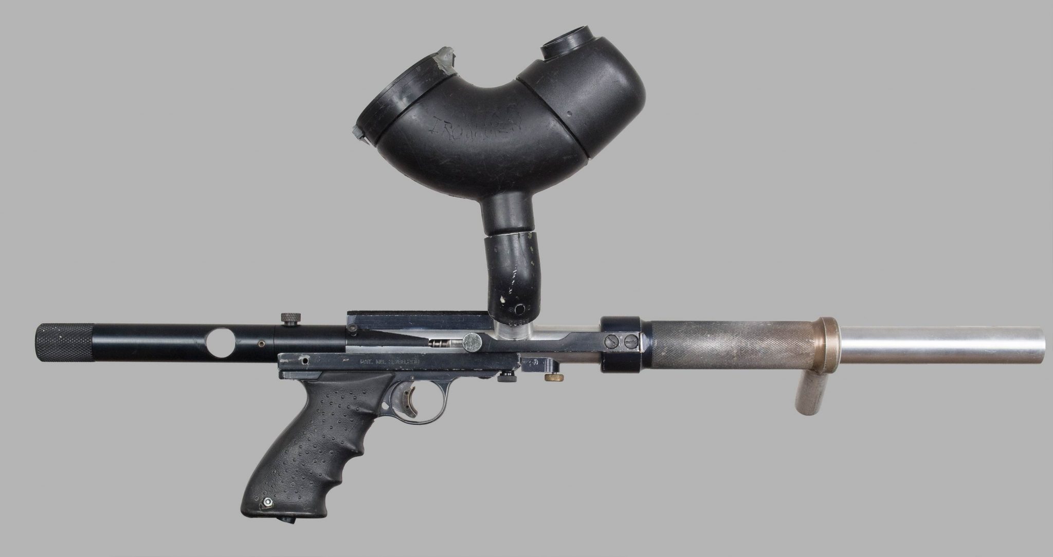 I would speculate that this paintgun had the body either replaced or polished, either before or after it left Rick’s possession. Likely after since Rick has mentioned to me that black anodizing (or painted camo) is his preferred finish. The internal brass hammer is likely a piece Rick modified, but the 12 gram changer on the back was possibly added after it left his possession.