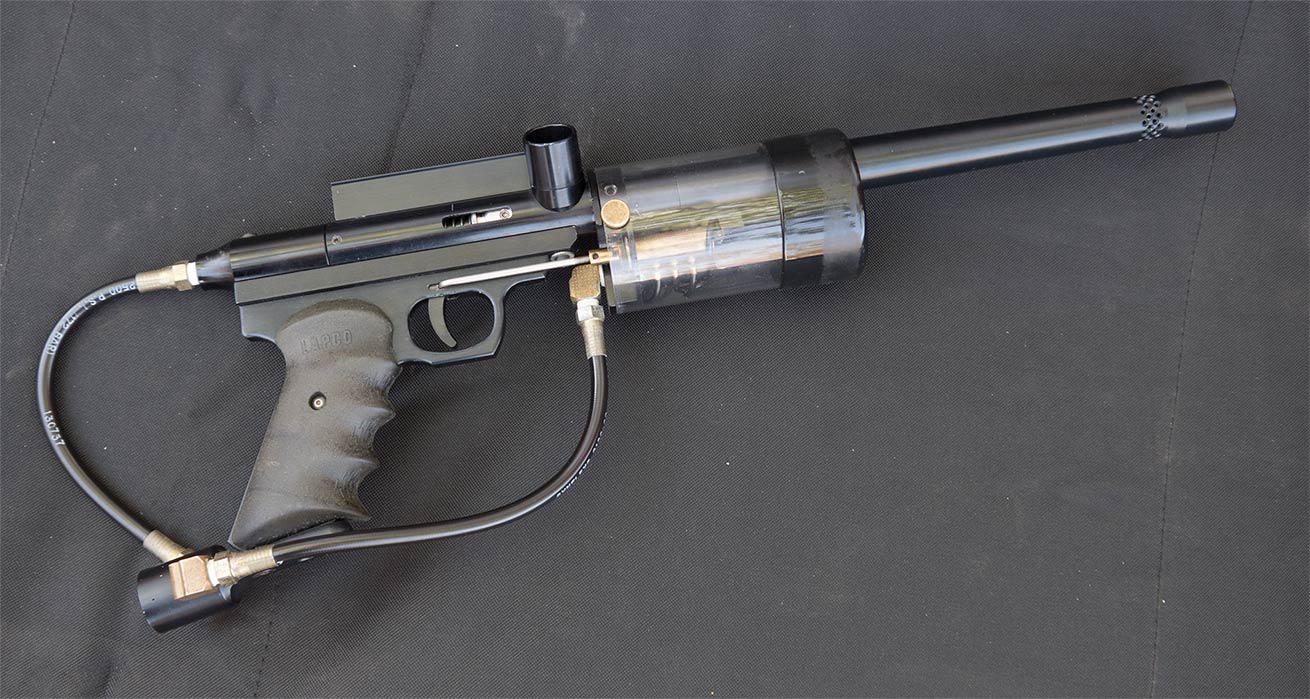 The pneumatics on his AutoSpirit’s round front block are a Palmer’s Pursuit Shop Rock Regulator, a Clippard Ram and an early Autococker brass switch.