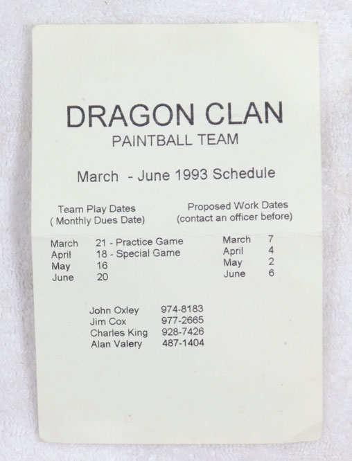 In 1993 Rob and his wife started on their first team, Dragon Clan, out of Arkenstone Paintball in Georgia. Turner writes: