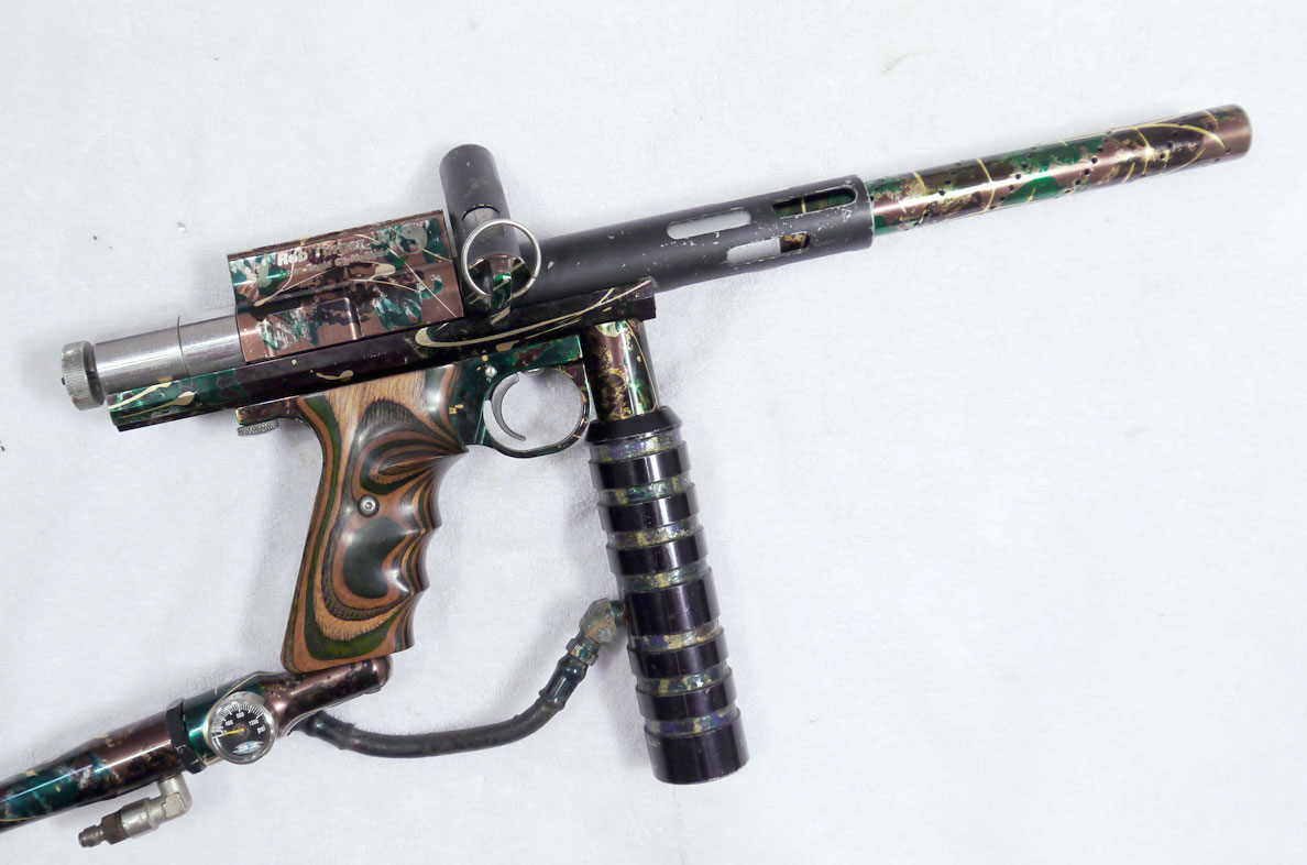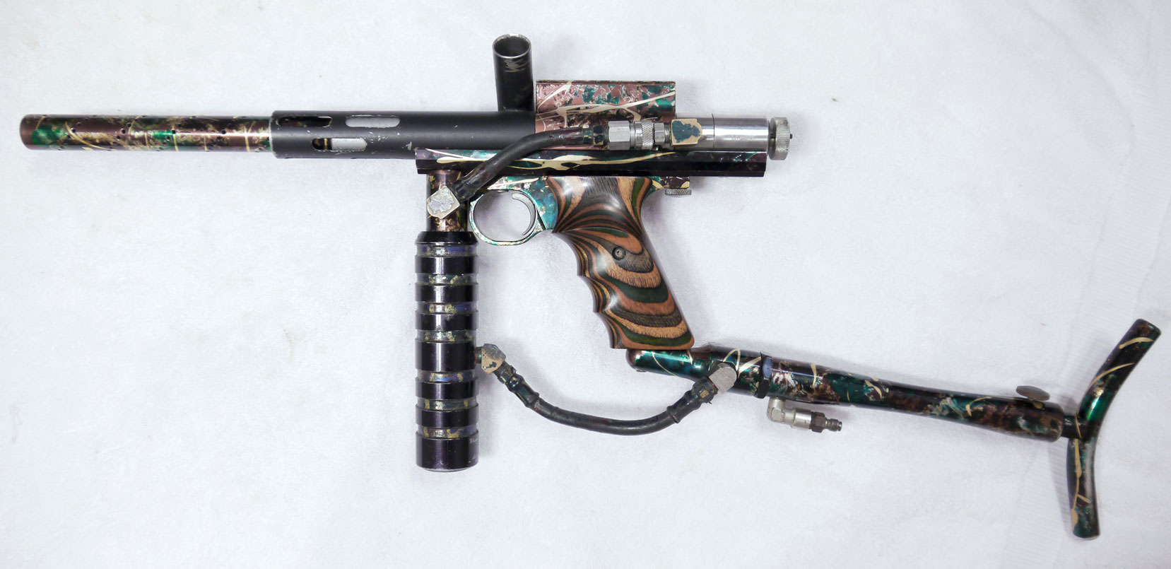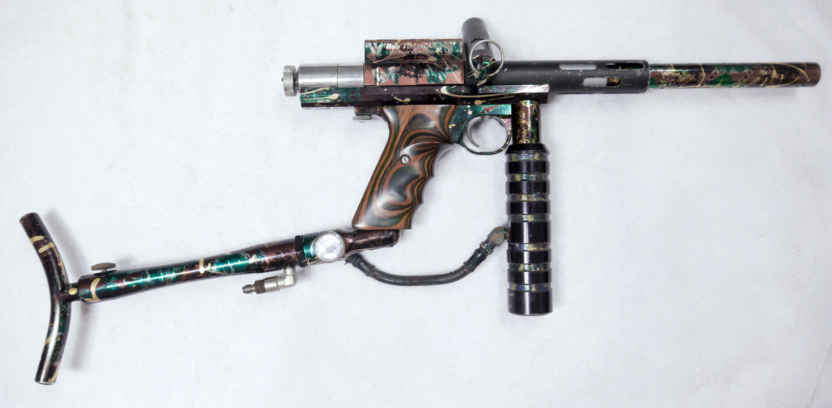 Around summer of 1994 Rob made the step up to an Airgun Designs Minimag which he purchased from “the airsmith named Tony at Paintball Atlanta. They were the Atlanta Blue Team that had been a pro team since the 80’s and somewhere in this timeframe changed to Team Xtreme. They were changing over to cockers. The minimag had camo rail, barrel and maybe trigger frame, whispering death exp chamber and the Airgun Design logo bottom line asa.”