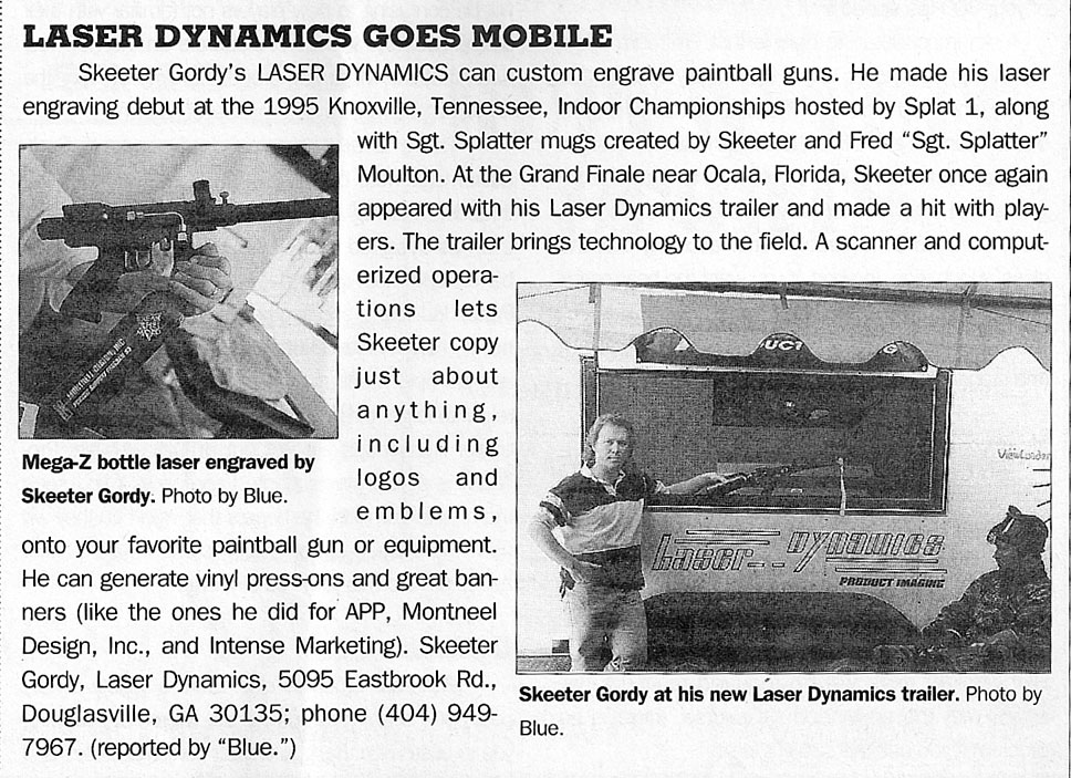 Here is a short article scan from the May 1996 issue of APG on Skeeter Gordy and his mobile Laser engraving trailer written by Michael “Blue” Hanse of EMR. Gordy’s laser engraving business was “Laser Dynamics.”