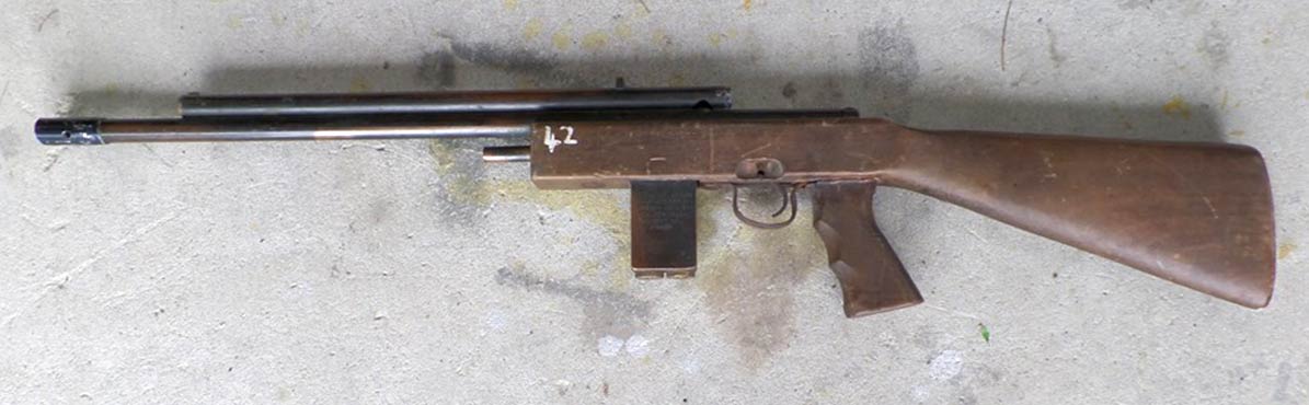 “[The rifle is outfitted with] an air chamber machined out of a solid brass block. [It’s a] pump action [and holds] 25 shots [in the] 62 cal mag. [This rifle would cycle] [100-]140 shots out of one co2 fill. Both [rifles (the PSI M-16 and the FN 49)] would probably be classed as dangerous these days. I didn’t know much about pressures back them.”