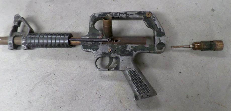 “[The body and air chamber are] all inline [in this paint] gun. Filled with co2, much the same as hpa today, [it held and shot] 25 shots of 62 caliber. I also made some 50 cal, but they were firing at 600 fps and you needed a flack jacket and welding mask to use them. Note pump grip is missing on [this paint] gun.”
