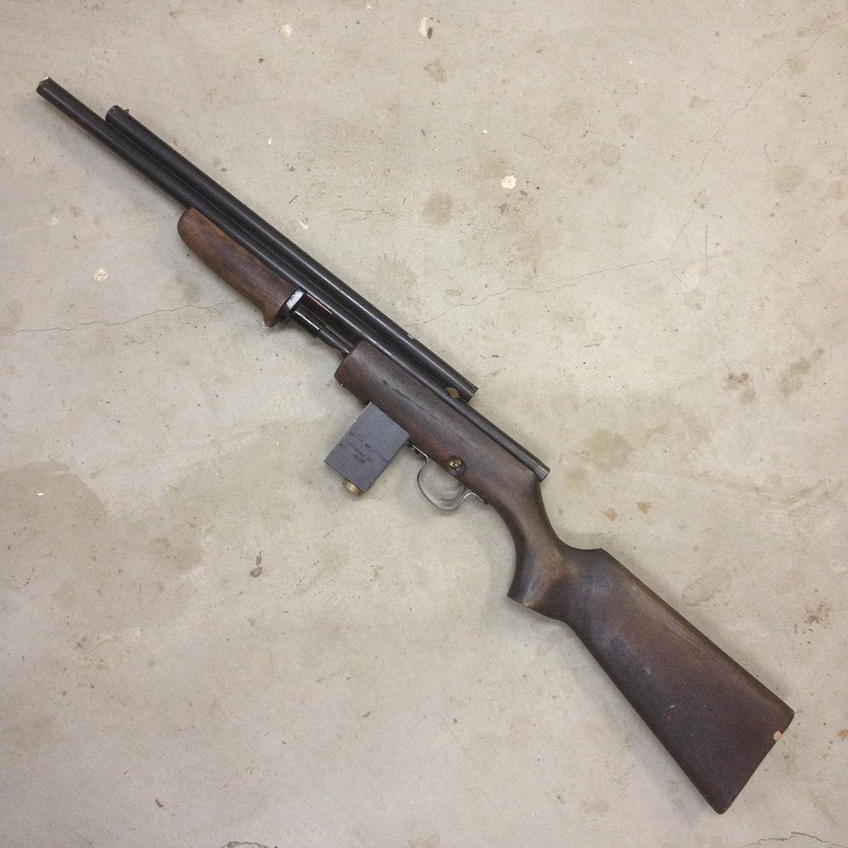 Another of Constable’s early creations is the PSI Lever Action Rifle. This rifle was likely built in 1987? The barrel and feed tube look to be the same construction as the 1200 (Hornet) but the valving and trigger mechanism looks similar to the FN 49 (roughly similar to a Sheridan style valve).