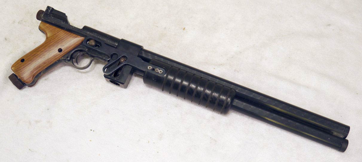•1984-1985 – Tim meets Stan Russell. Stan’s first involvement with Tim was the screw attached to the bolt to make cocking the PG pistols easier. 2nd was the speed loader attached to the horizontal feed tube. Tim remembers that he would get royalties to each speedloader that was built by Sheridan when this modification was integrated on the pursuit pistol.