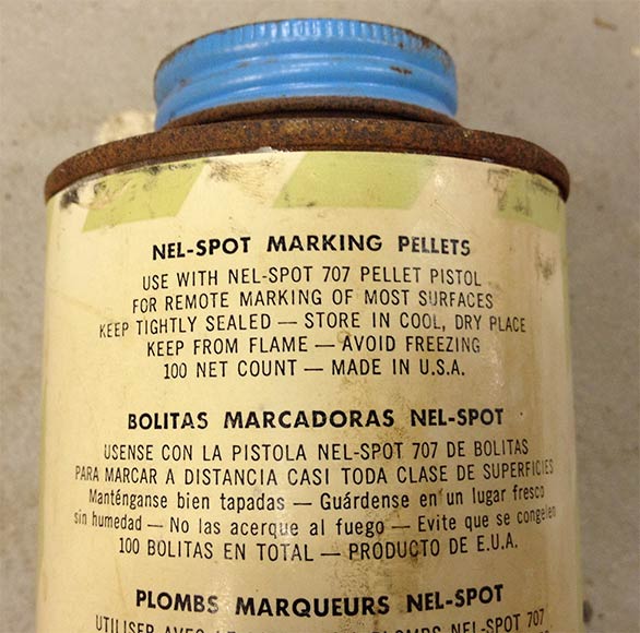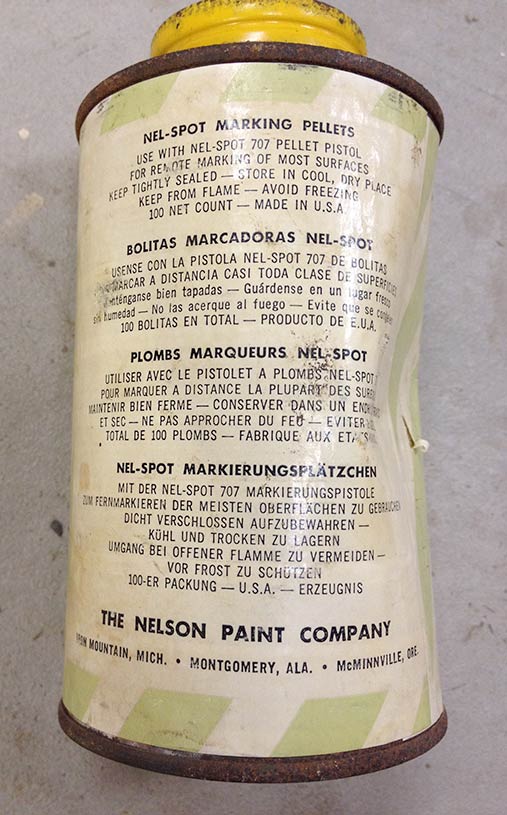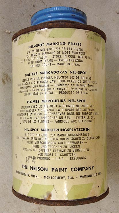 The back of the blue can does have a stamp of 7-83 but I don’t think that’s the date since by that time Nelson wouldn’t have been selling the Nelspot 707 and would have already to moved to selling the Nelspot 007 (or Quick Splotch?). And the paint at that time would have likely been the aluminum tubes (with the cardboard oil based Super Spot tubes sold between the tin cans and the aluminum tubes).