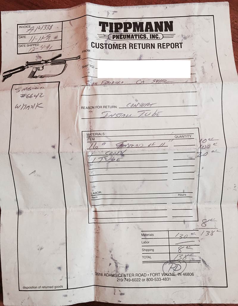 On November 11th, 1991, Burritoconnoisseur, sent his SMG-60 in to Tippmann for the direct feed breech conversion. The receipt says that the conversion to Semi Auto and Direct feed was 100 dollars, the tube (maybe a siphon tube?) was 20 dollars and a 16 inch barrel instead of the stock 11 inch was an additional 10 dollars.