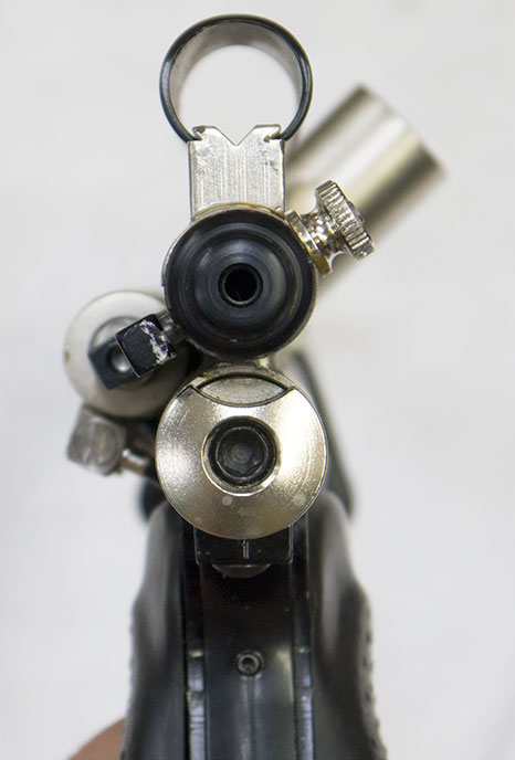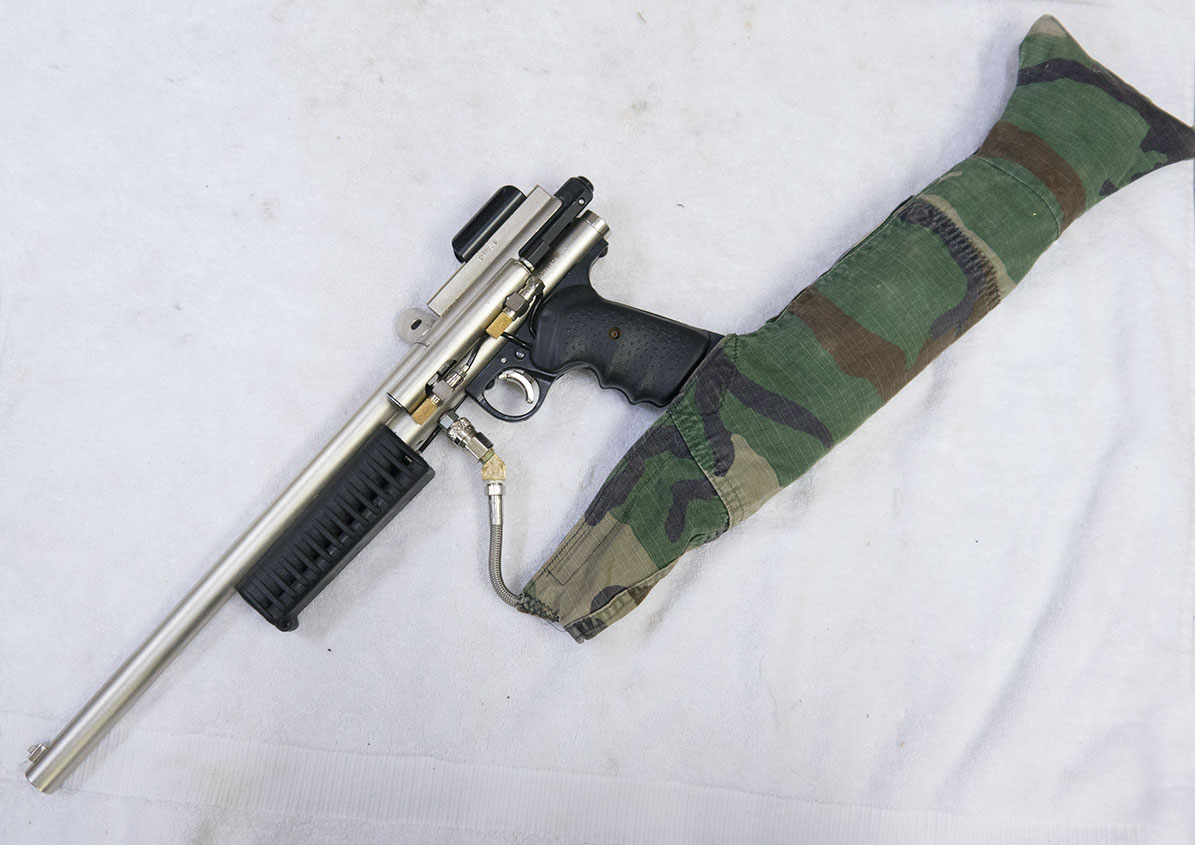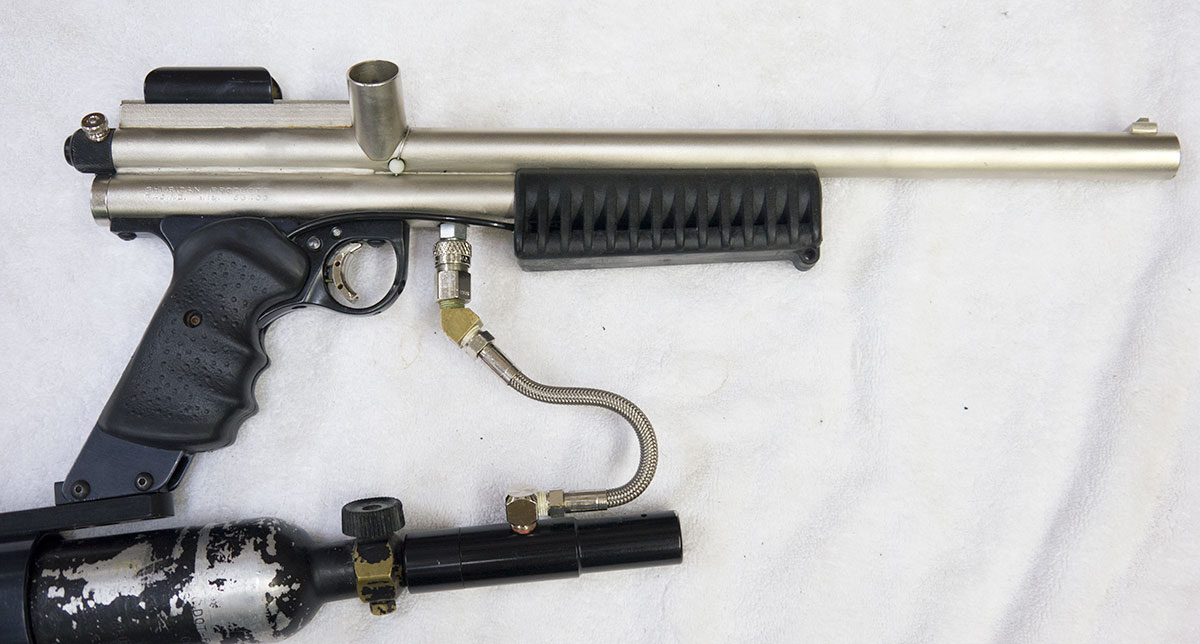 But aside from the typical features found on Stan Russell’s 1st generation Annihilators, Tosh’s Annihilator also featured unique brass front sights, knurling on the bolt, a tall back sight rail, and possibly a longer than normal barrel? I had thought maybe Tosh had this paintgun rebarreled at Palmer’s but if that were the case then Palmer’s would have shortened the bolt to standard P series.
