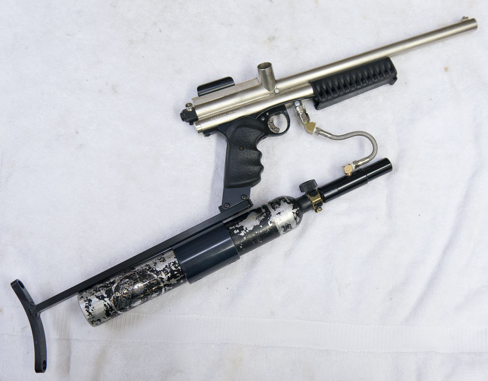 •Tosh also added mufflers to his qevs and calls them silencers. I hadn’t seen mufflers on qevs before but they do have a neat effect, although they might cancel out some of the quickness of the qevs by obstructing the air vent passage, but that would be a question for paintballtek.com