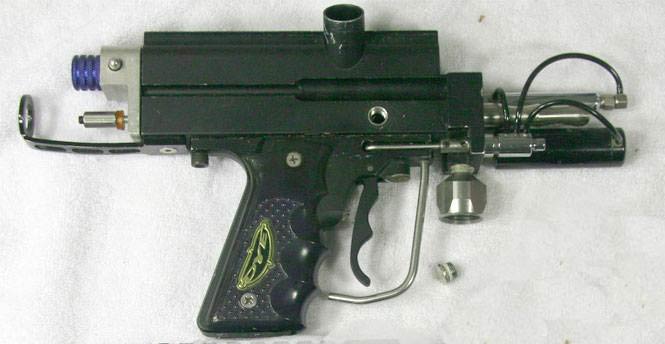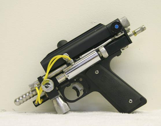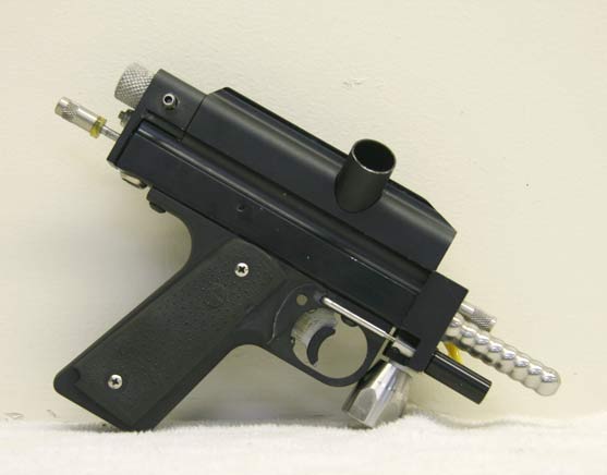 I bought this tiny P-blocked reverse Minicocker about 8 or 10 ago. I haven’t seen too many shops built reverse Autocockers and since this paintgun came from somewhere in the Southwest I thought it was likely built by Brad Nestle while he was doing custom work at either Barritz, Olympic, or PBMax.