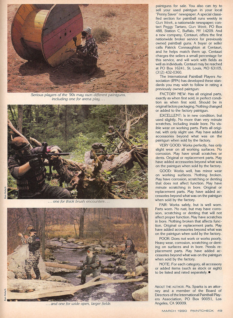 Page two of Jessica Spark’s March 1990 Paintcheck article on buying and selling used Paintball Guns.
