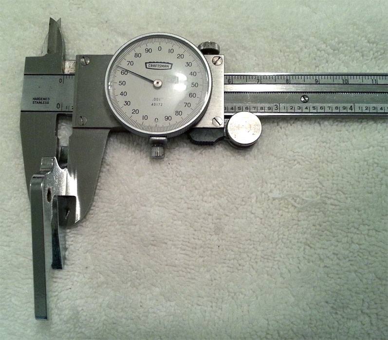 Helpful photo showing the width of an autococker trigger plate. This is the dimension that needs to be measured to check if a trigger shoe will fit. Trigger width for this Stock plated wgp post 98 plate is .163.