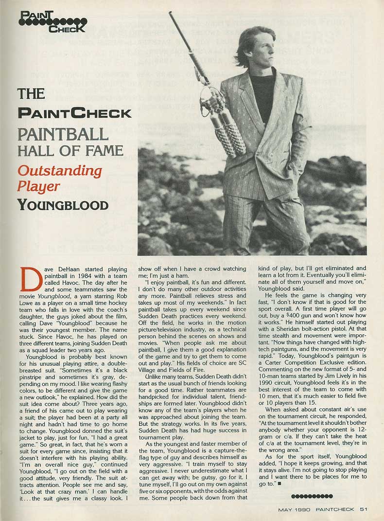 Great write up from the Paintcheck May 1990 Hall of Fame Section on on Dave “Youngblood” DeHaan paired with a fantastic glamor shot of Youngblood and his gigantic Carter Machine Comp barrel setup (entire article embedded below).